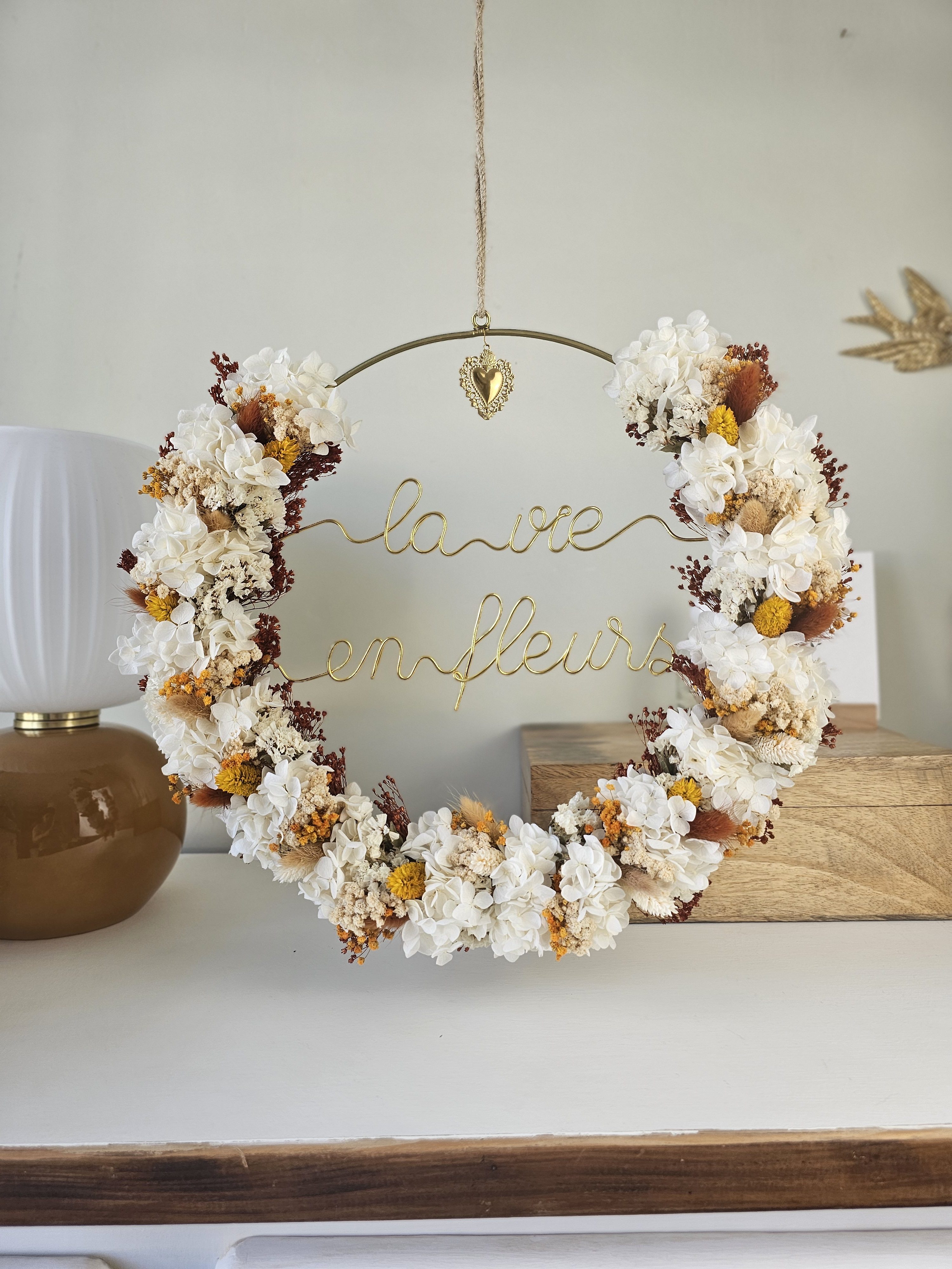 Sur un cercle en laiton de 30 cm, un mot ou une phrase en fil doré aluminium s’inscrit au centre, entouré d’une généreuse composition de fleurs séchées et stabilisées.